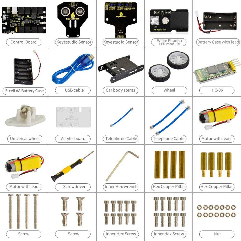 Now, let’s DIY the KEYBOT robot. The KEYBOT robot is based on easy-to-use and flexible open-source Arduino platform. KEYBOT control board comes with the RJ11 plug, so it is very easy to connect other sensor modules with only one cable.