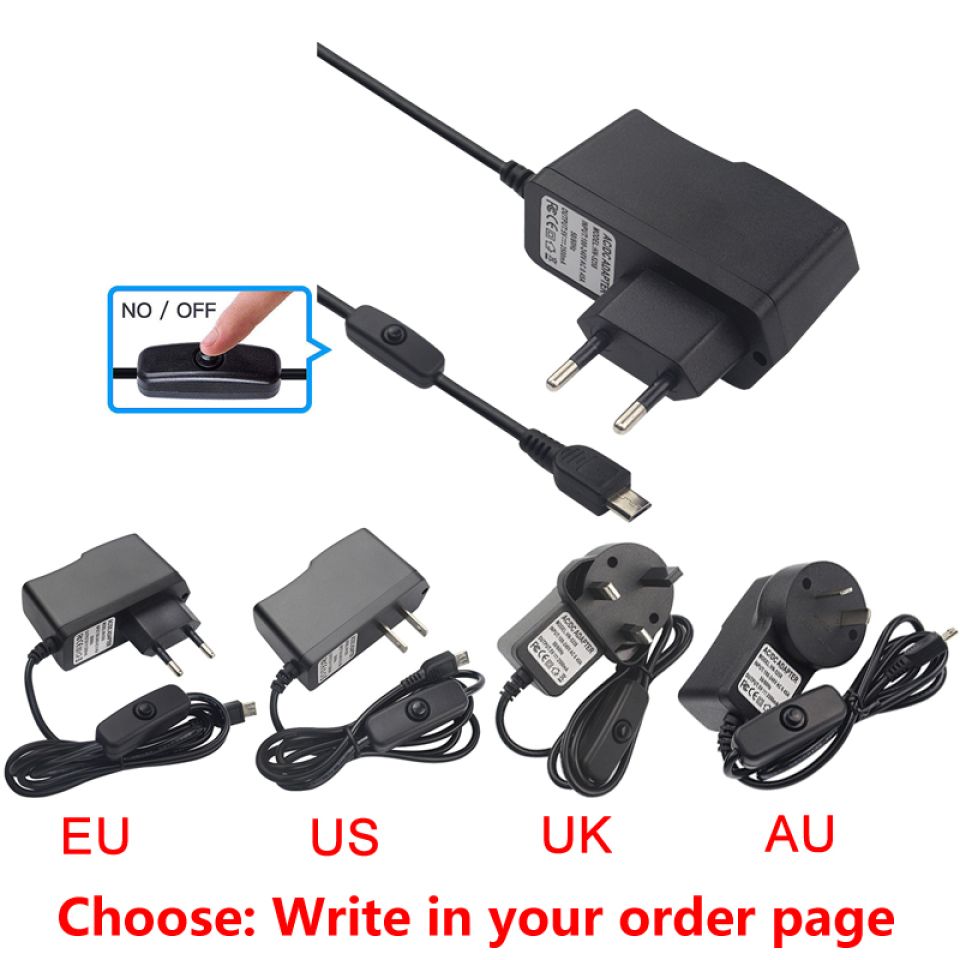 2. 5V 2.5A power adapter with switch, it is easy to power on and off, EU / US / AU / UK plugs available.